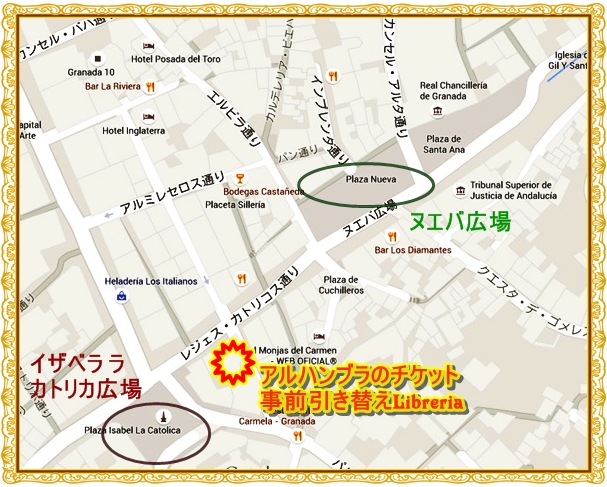 Tienda Libreria de la Alhambraがあるのは、グラナダの観光の中心部であるヌエバ広場から徒歩5分位の場所だ。
