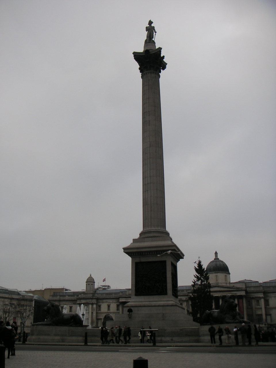多くのバスがこの広場を拠点としているため、交通量が激しく、いつも混雑しにぎわっている印象を受ける広場です。広場の中心に立つネルソン提督の像は、ロンドンのランドマークの一つで、英雄・ネルソン提督をたたえて造られたものです。台座に描かれている絵は海戦の様子を表し、台座の周りには4頭のライオンが鎮座しています。