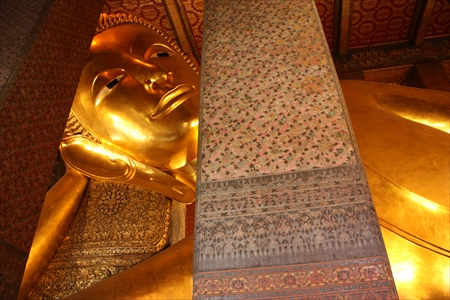 バンコクの有名な寺院で、珍しいリクライニングブッダ(横に寝ている仏像)が見学できます。仏像は金色で、神々しい姿形です。