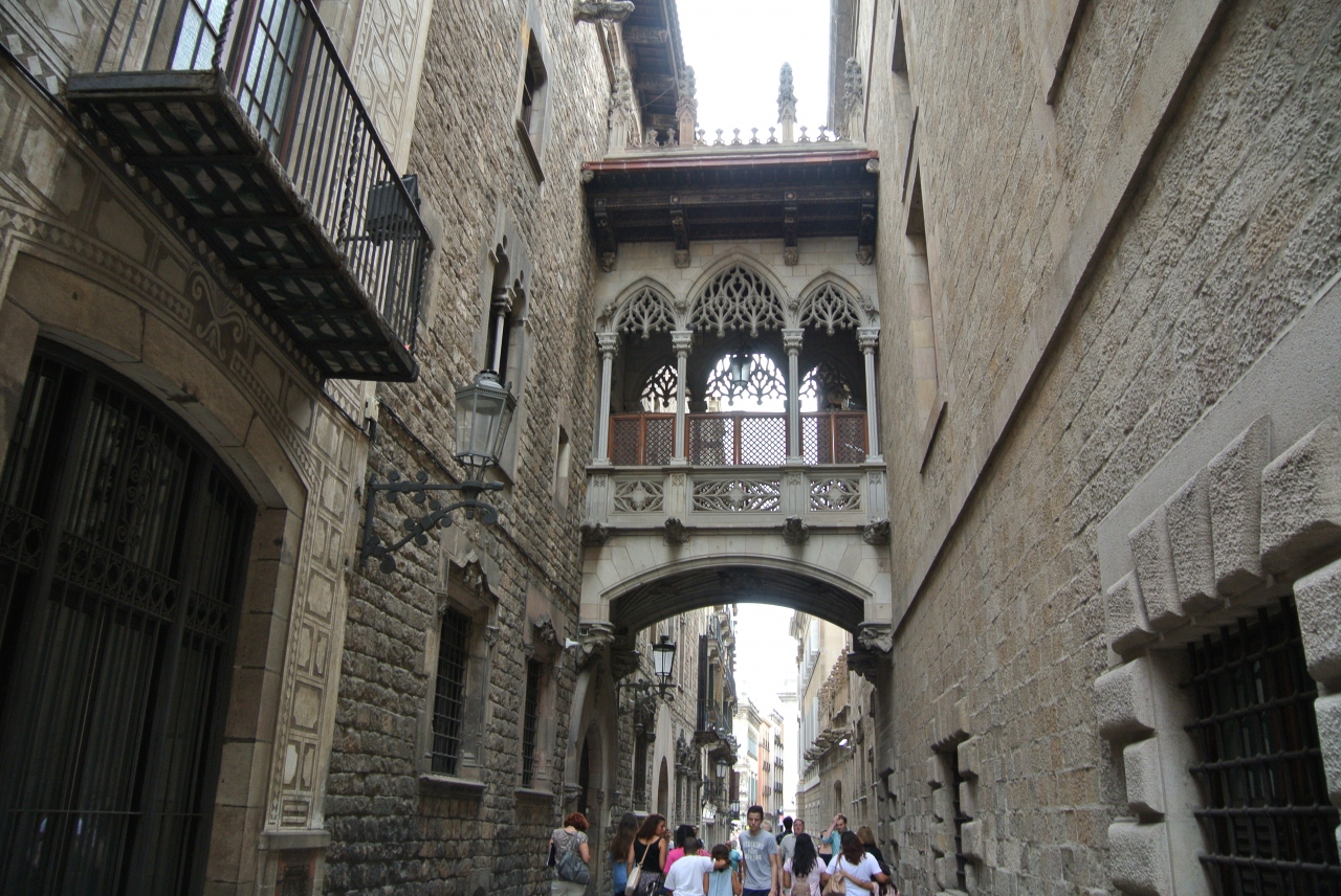 すごい人出でしたが、カテドラルやサン・ジャウマ広場、王の広場など、見どころがギュッとつまっていて、とても雰囲気のある地区です。ガイドブックなどに良く載っている、小路の上に架けられた渡り廊下も彫刻がきれいでロマンチックでした。
