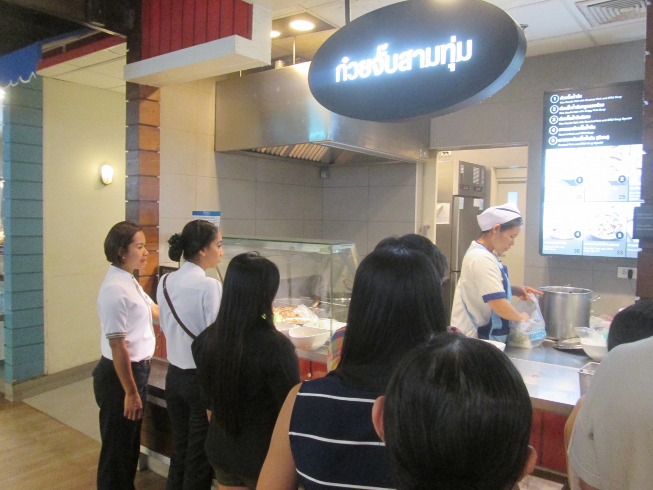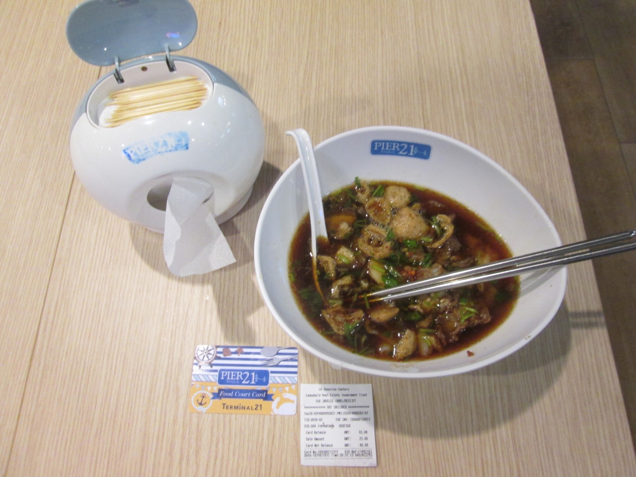 きれいなフードコートで気軽に利用できます。豚の肉と肝などがたっぷり入ったパクチーが効いた出汁に入ったタイの麺料理を食べました。1杯25バーツ。高いものでも50バーツ前後でした。安くておいしいフードコートです。