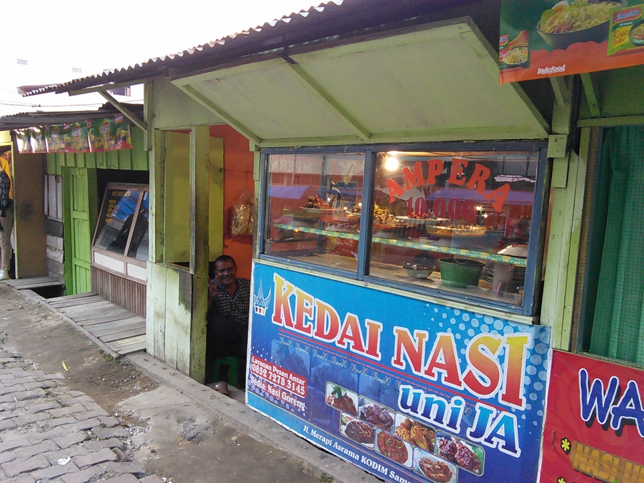 コック要塞西側にある大きな病院の北側の通り(Jl.Merapi)に掛かる別棟との渡り廊下の下付近にあります。ガラス窓越しに並んだおかずの下の「KEDAI NASI uni JA」の看板が目印です。