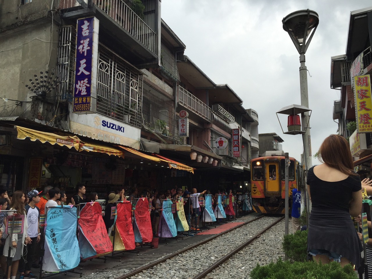 十分老街には線路沿いに天燈(ランタン)上げをすることができるお店が沢山あります。