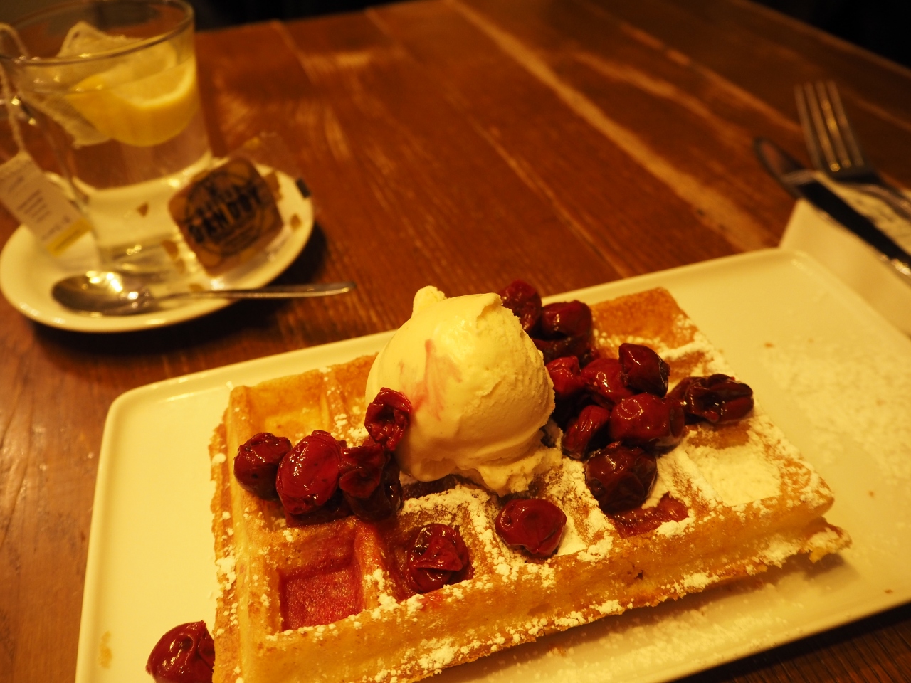 頼んだものは、バニラアイスとチェリーの載ったブリュッセル風ワッフルとカモミールティー。