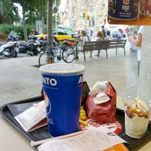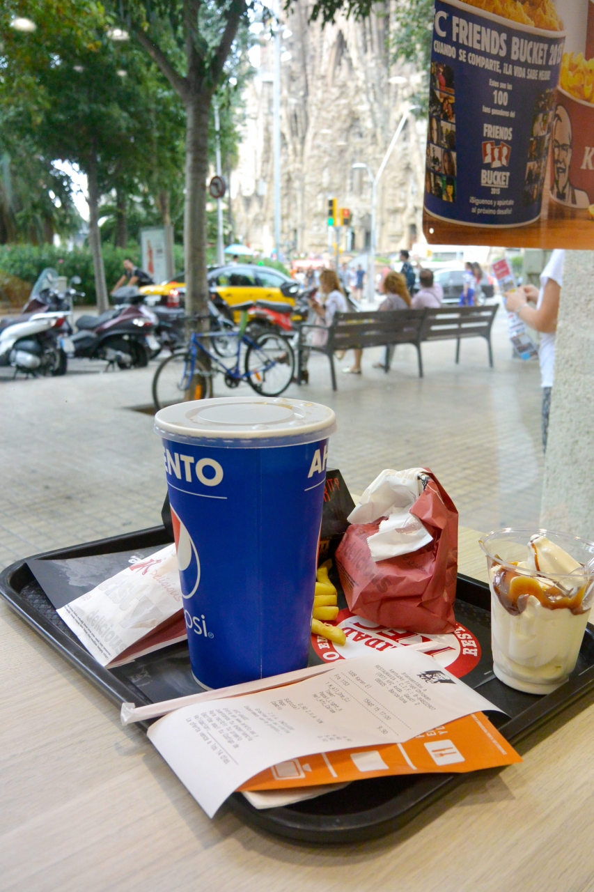 小雨も時々降るあいにくの曇り空で、池に映るサクラダ・ファミリアを見ることはできませんでした。そのかわり?広場すぐ横にあるケンタッキーの窓際から、サクラダ・ファミリアを眺めながら食事をしました。まさに「サクラダ・ファミリアの見えるケンタッキー」です。