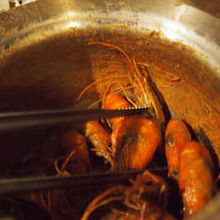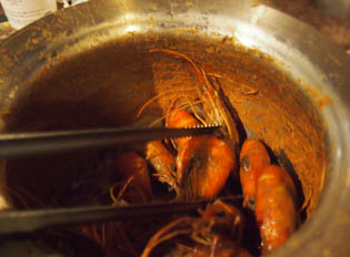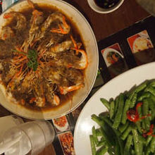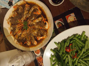 場所が分かりつらかったのでタクシーでお店を告げて直行。有名店らしくすぐ分かったようです。エビ料理が自慢でどれもビールに合う料理でした。料理はオーダー、ご飯・食器はセルフサービスのシステム。お薦めは泥に埋もれたような胡椒たっぷりの胡椒蝦ととにかくにんにくの利いた蒜茸蝦。どちらも絶品です。