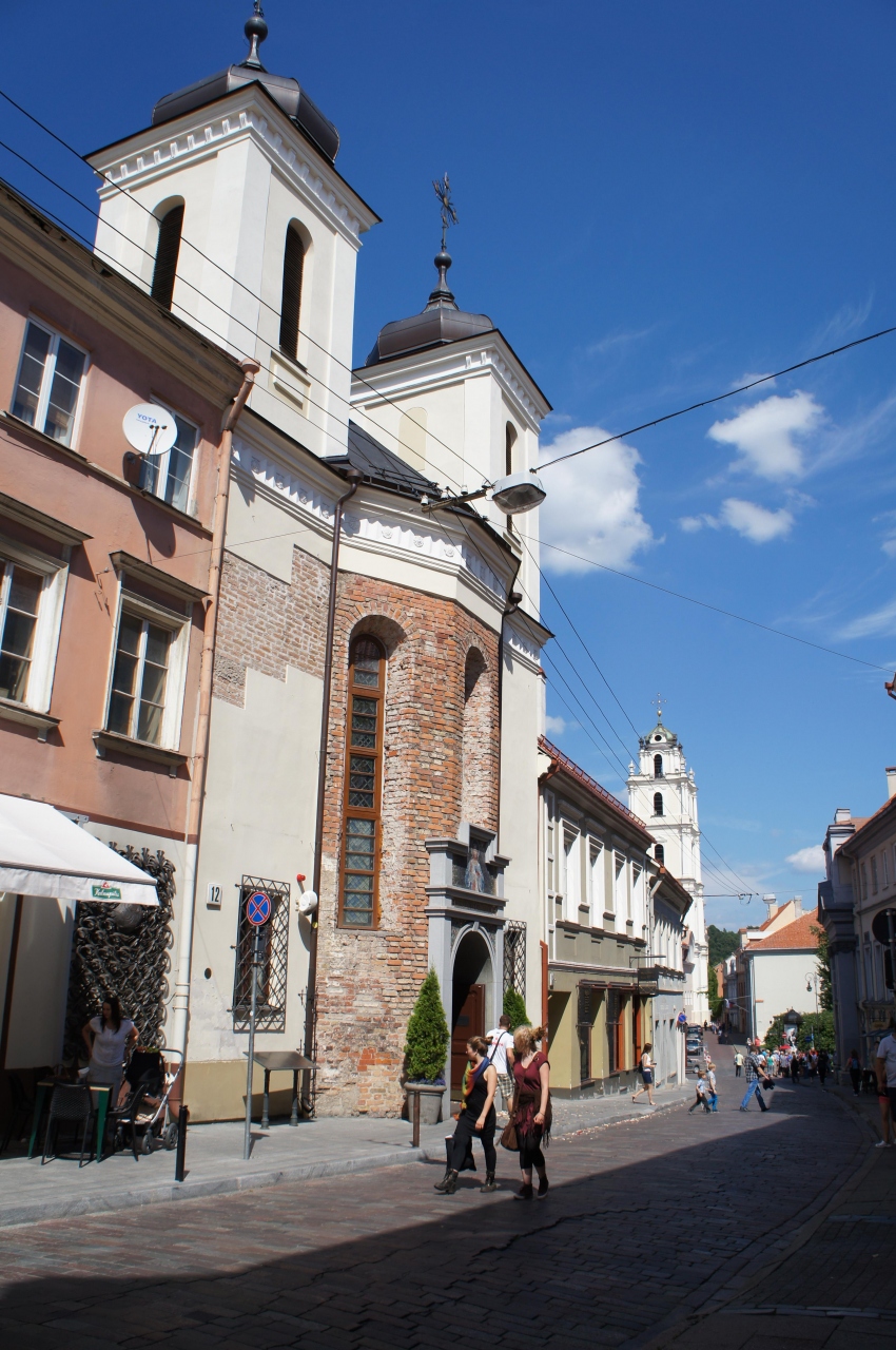 ちょうど旧市街の中心部にある通りです。聖霊教会を過ぎて振り返ると聖ヨハネ教会の鐘楼が見えました。ちょうど聖霊教会の角を南に入ると、お洒落なレストランやショップが並ぶスティクリュ通りで、かつてユダヤ人街だった趣ある地区に行けます。