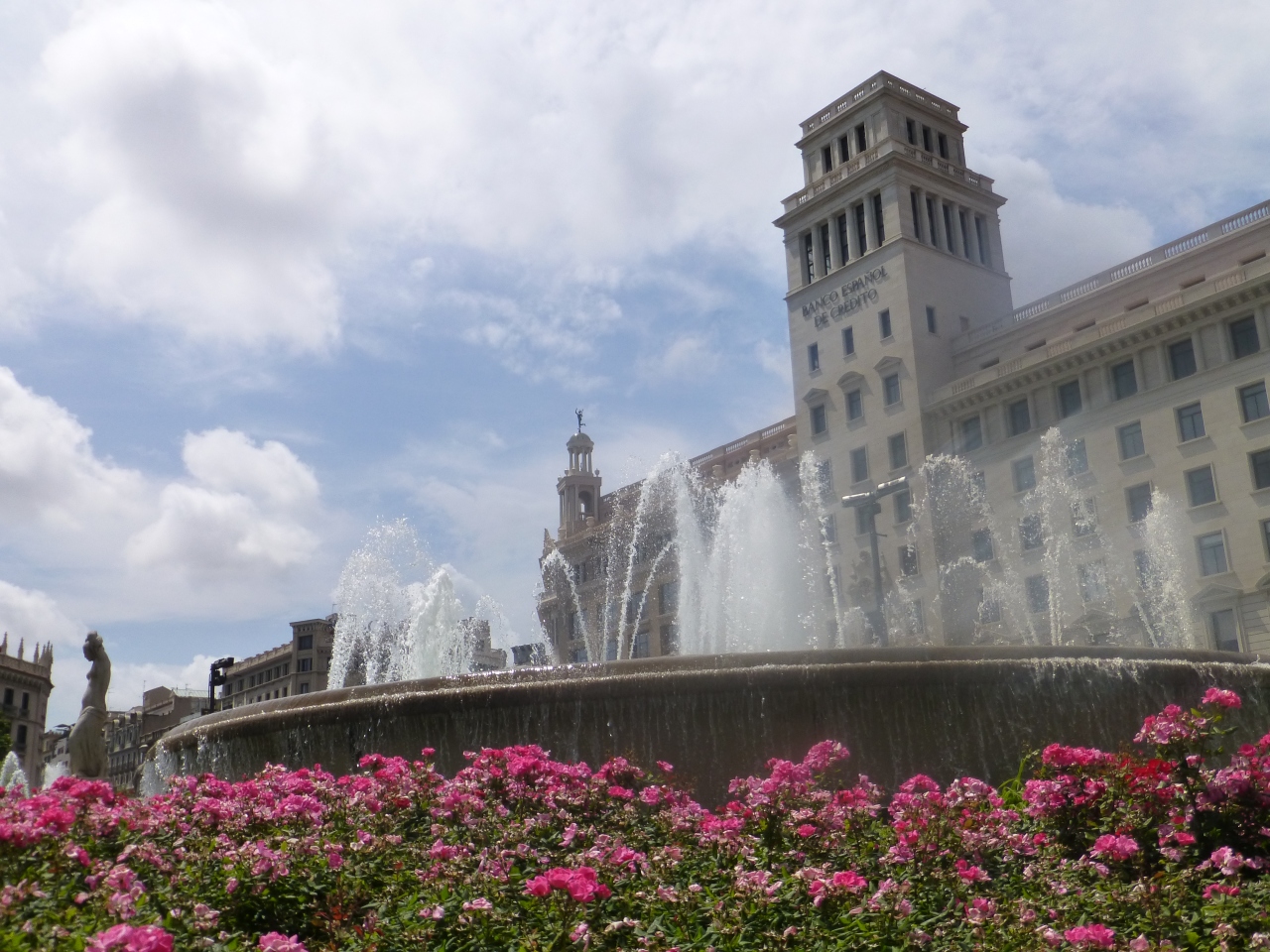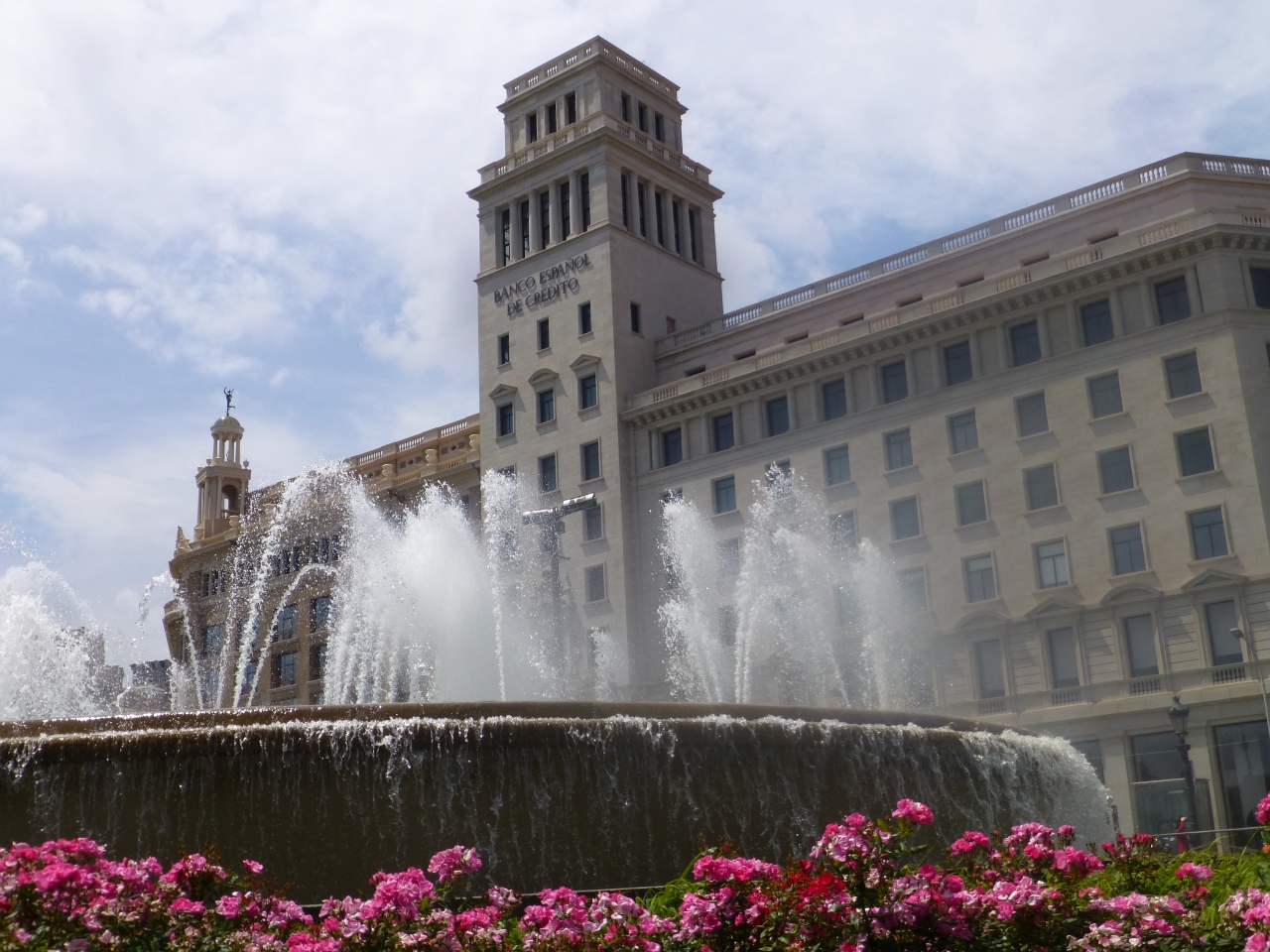 なんども広場を利用しました…バルセロナの中心地広場!;バス発着地のため/ 広場の周囲は デパート・食料品・お土産も!/ メインストリートの起点(ランブランス通り,グラシア通り;観光ポイント)/ 待合わせ場所;連れが買い物で 綺麗な花の噴水で待っているのも良いですョ(^-^)