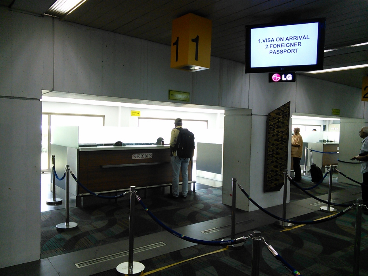 通常のイミグレの手前にビザ代(35USD)を支払うカウンターがあります。クレジットカードでの支払いも可能と言われましたが実際の窓口の職員が「できない」と言ったり「できる」と言ったり、あげくに「I try.」と言い出し不安だったのでドルキャッシュで払いました。レシートをもらいすぐ横のVOA専用イミグレで入国審査を受けます。通常のイミグレとは別ラインです。入国カードの記入は必要ありません。出国チケットの提示はなし。たまたまかもしれませんが通常のイミグレ共にガラガラ状態。待ち時間はほとんどなくあっさり取れました。