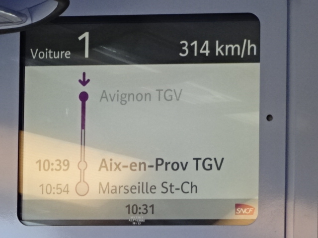 パリのリヨン駅からマルセイユ サンシャルル駅まで乗車。すべて2階建ての車両で1等は1階の一人掛けの席だった。フットレストやヘッドレスト電源や読書灯やリクライナーシート、専用テーブルとダストBOXがあり快適だった。無料WIFIも使えた。