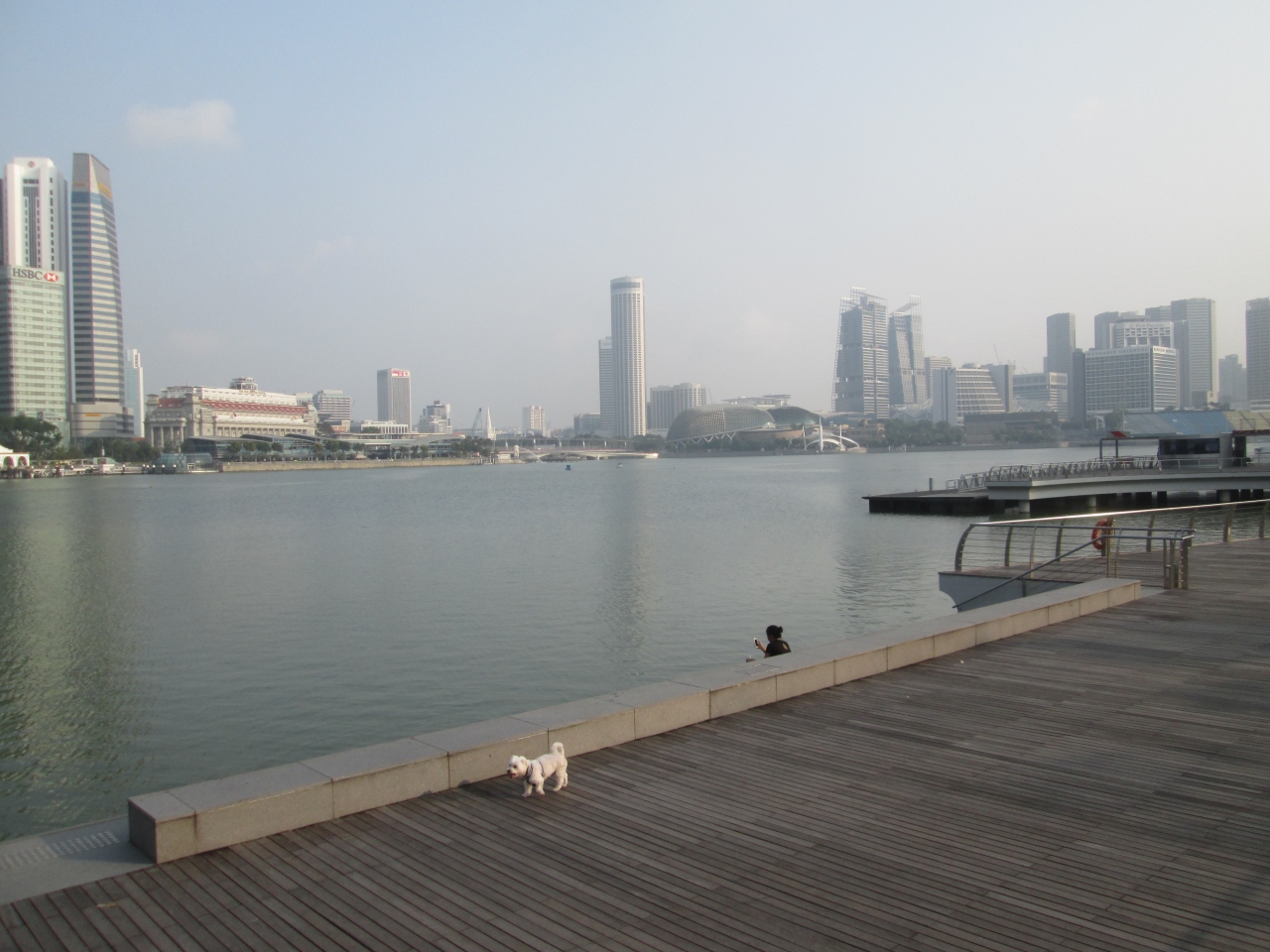 マリーナ・ベイ・サンズの大型ショッピングセンターの前にある遊歩道です。マリーナ・ベイの対岸には高層ビル群とマーライオンパークが見えます。天気の良い日は勢いよく水を吹いている大きい方のマーライオンが見えます。