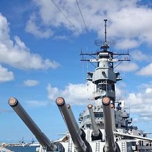 フォード島に係留されているので、アリゾナメモリアルからシャトルバスに乗って行きます。バスを降りると迫力ある戦艦ミズーリが出迎えてくれます。1992年退役となるまで活動していた戦艦を見学することができるのです。入口で日本語でのガイドツアーがすぐできる旨、係員さんが声を掛けてくれましたのでお願いしました。若い女性でとても感じよくわかりやすい説明でした。歴史を別の角度からふれてみる良い機会でした。