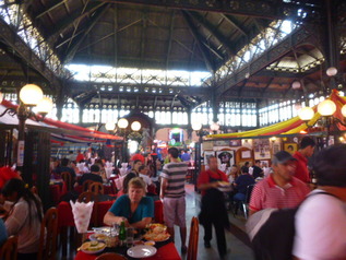 沢山の魚屋さんと中央と外周にレストランが並んでいます。