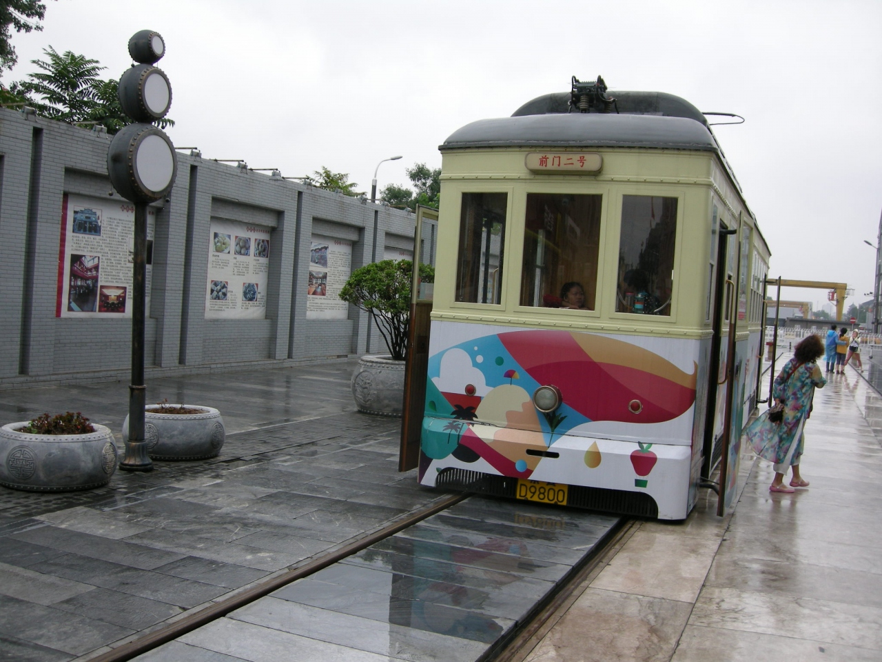 紫禁城の門前町として栄えていた場所で、北京ダックの全聚徳や焼売の都一処などの老舗が並ぶ繁華街です。2008年に当時の写真をもとに清朝末期の街並みに復元されました。通りの真ん中を路面電車が走っています。海外の旅行者だけでなく、中国国内の観光客も大変多く集まっているようでした。