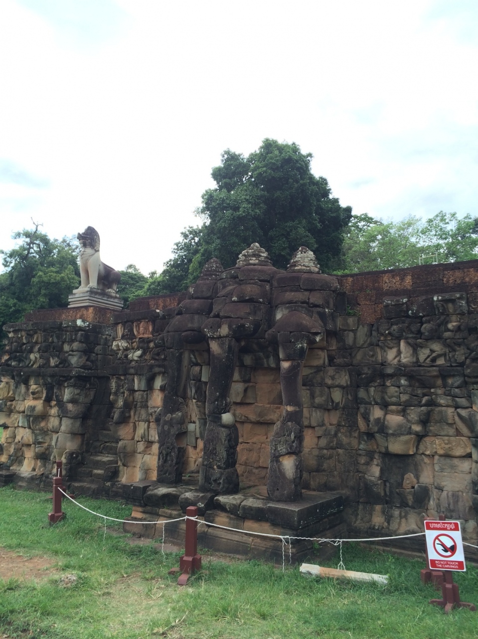名前のとおり、象のレリーフがたくさん見られます。ガルーダ像のレリーフも並んでいます。テラスに向かって城壁の「勝利の門」から、まっすぐに続く道路を通って、昔は、兵隊が行軍したそうです。実際の象にのり周囲を歩くこともできるようですが、暑さと遺跡群を歩き回っての疲れに乗りませんでした… 最近まで、地元の人たちのピクニックスポットだったそうですが、ごみが散乱するので最近禁止されたそうです。そのためか大変キレイでした。