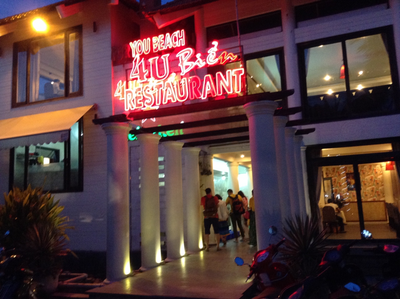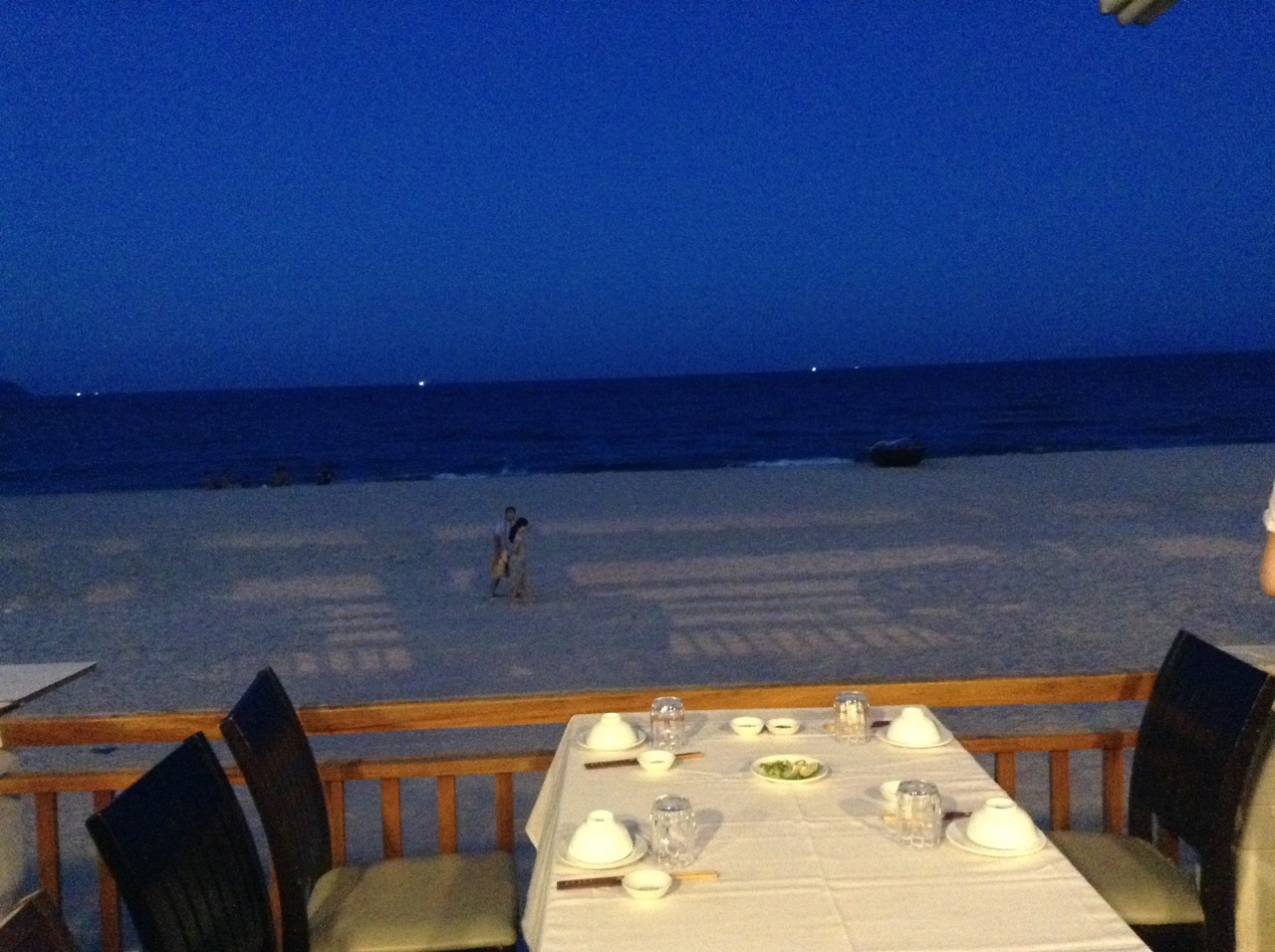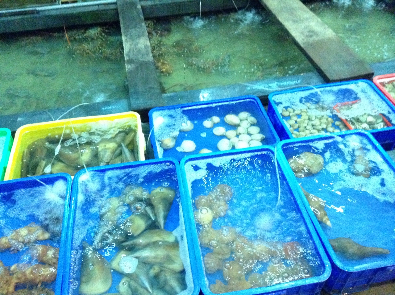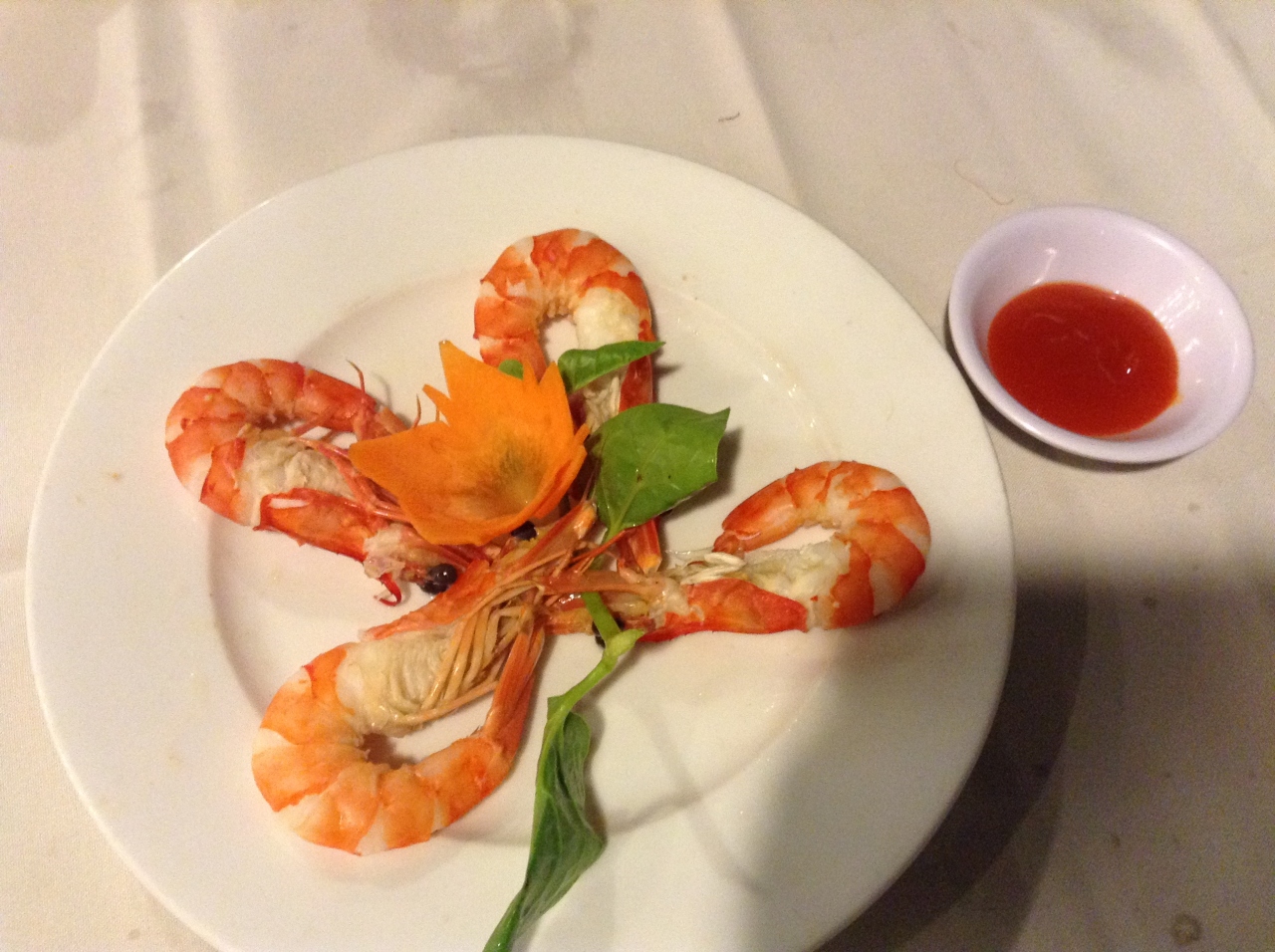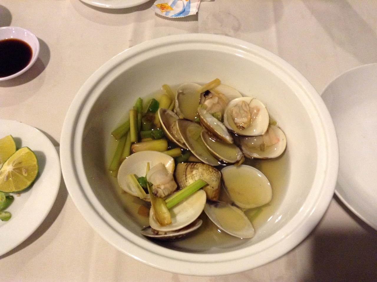 入り口を入って左側に生け簀がずらっとならんでいます。そこで選んでいる人達もいましたが、私達は写真のあるメニューを見て選びます。写真のないメニューもありました。まず、はずせないのが、はまぐりのレモングラス蒸し。半分をお願いしたら、500gだそうです。そして、えびとかにを蒸してもらい、塩こしょうにレモンをしぼったものにつけていただきます。英語を話すスタッフさんが少なくて、蒸したてで熱いかにとえびをむいてもらうのに難儀しました。2階ではパーティーをしていて、歌がガンガンにきこえてきます。地元の人たちでにぎわっていました。シャコもおいしいということでしたが、とてもそこまでいきませんでした。たくさんの人ときて、シェアして食べれば、色々なものがいただけますね。