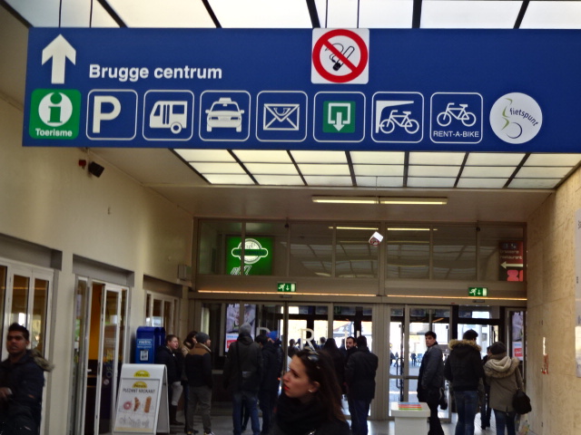 タリスの降車ホームは一番西側にあり、ブルージュ方面は反対側でコンコースを歩きます。通りにはチョコレート店やみやげ店、スターバックスなどがありました。ベルギーらしく右手方向には大きな建物に貸し自転車、左方面には各方面行きのバス停があり、停車場でチケットを購入出来ました。