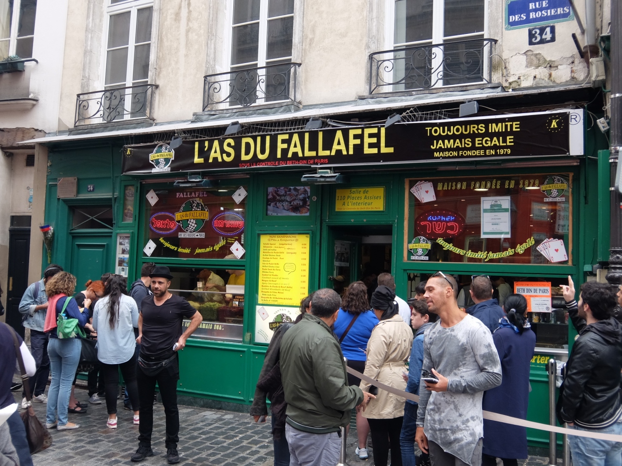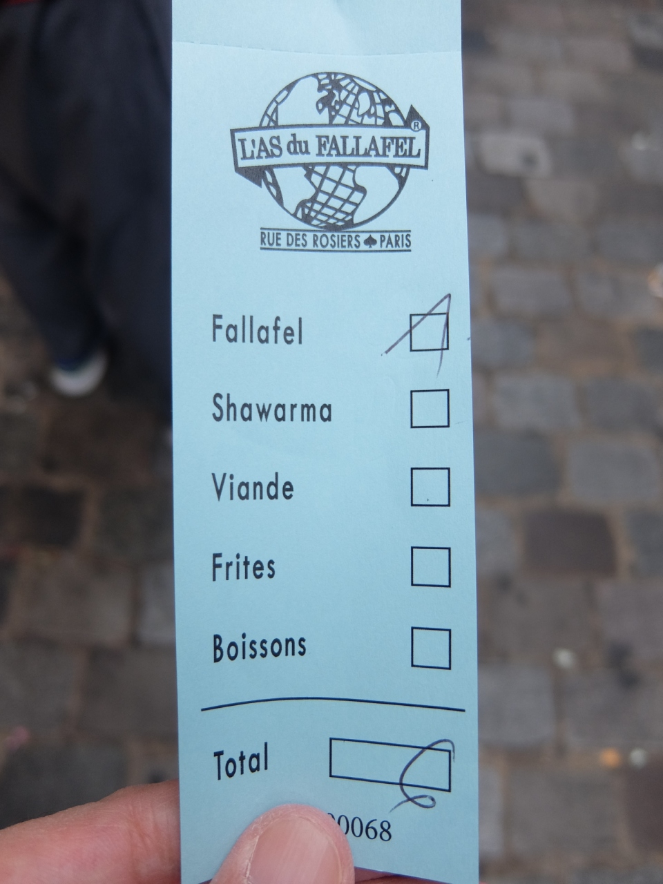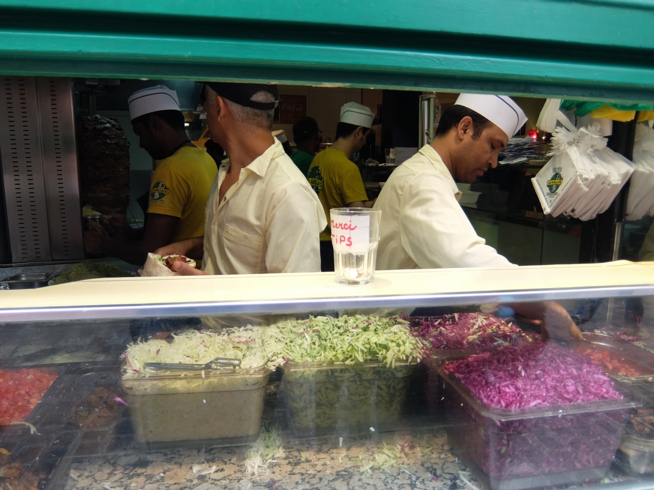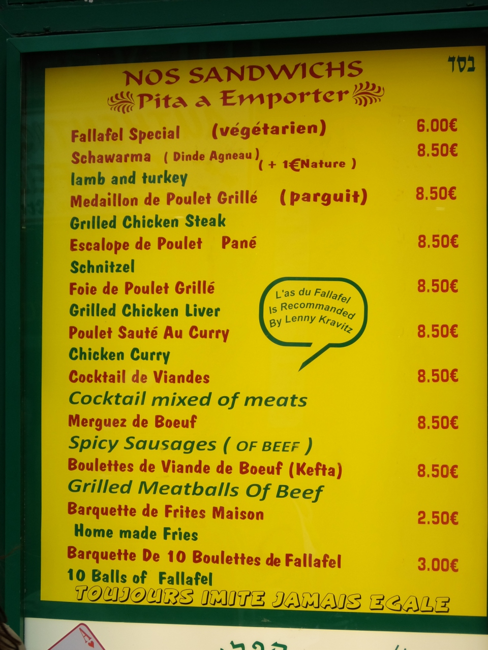 ちょうどお昼時だったので,寄ってみました。お店の周辺は結構な人だかりでした。テイクアウトの列と中で食事をする人の列ができていました。テイクアウトの列は並んでいてもそれほど待たずに買うことができます。列に並ぶと店のお兄さんがやって来るので,そのお兄さんに注文して,その場で支払います。注文票を受け取り,それを作っているところで渡して商品を受け取ります。お兄さんお勧めは「ファラフェル スペシャル」6€。日本から来たというと,「メチャメチャおいしい!」と言っていました。ひよこ豆の小さなコロッケとキャベツなどの野菜がピタパンに入って,ソースがたっぷりかかっています。おいしかったです。