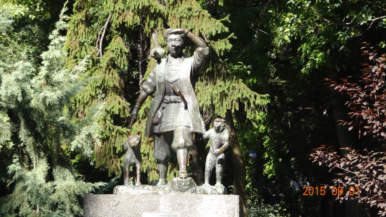 公園内には、何故かサルとイヌ、キジを引き連れた桃太郎の銅像があります。