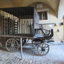 入口には、ギロチンや水責めで使われた拷問器具、囚人を運ぶときに使われた