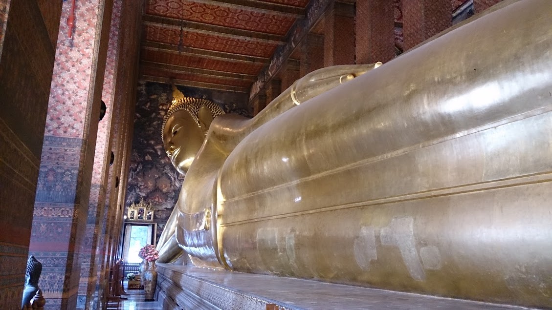 チャオプラヤ川のエクスプレスボートで最寄りのター・ティアンの船着き場から徒歩でアクセスしました。船着き場の目と鼻の先で徒歩1分ぐらいの場所にあって、入場料にはミネラルウォーターの引換券付きで、ちょっとびっくりしました。巨大寝釈迦仏は想像していた以上に大きくて、実際の印象は金色の壁か?という迫力。写真に収めようと思っても全身を収めることができるところが巨大なお堂の中にも2か所ぐらいしかなく、凄さを感じます。こちらのお堂も肌が露出した服の方には羽織る物を寝釈迦仏のお堂の入口で無料で貸し出してくれるので、それを着用となっちゃいます。こちらは寝釈迦仏が有名ですが、それはワットポーの一部でそれの何倍もの広さの境内に装飾が美しい塔などが所狭しとあって、ゆっくり見れば平気で2〜3時間かかります。自分はかなり駆け足で周りましたが、次回はゆっくりと周りたいと思わせる場所です。