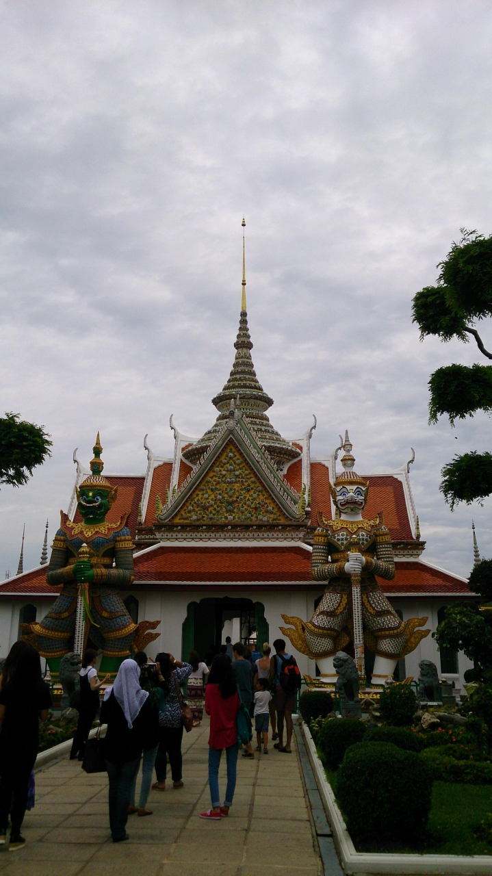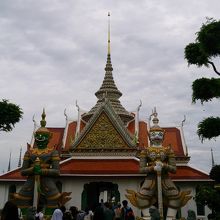 ワットアルンの入口部分にある建物で尖塔の屋根で、かなり細かい装飾がされており色鮮やかな細かい細工が施されており、切妻部分の屋根は白い縁取りに原色の赤と橙色で壁部分は真っ白で窓枠は緑色なっており、特に白さが際立って真っ白という状態です。この建物はとにかく派手という言葉がピッタリです。また、尖塔屋根の下の部分はお花の様な細かい細工がされており、非常に明るいです。これ以外にも屋根の淵の部分にいたるまで、手を抜かずかな細かく、明るい原色系の色合いの装飾がなされており、このお堂全体がド派手になっています。