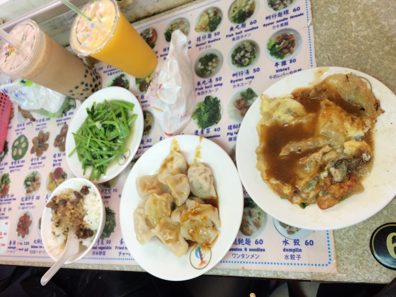 台湾グルメの楽しみの一つが安くて美味しい、種類豊富な夜市のごはんです。あいにくの雨でしたが、地下の店舗で快適にいただけました。ルーローハンや牡蠣入りたまごやき、青菜炒め、水餃子、果物のフレッシュジュースを食べましたが本当に早くて安くて美味しい!メニューがカタカナで書いてある店舗もあり、困らずに注文できました。