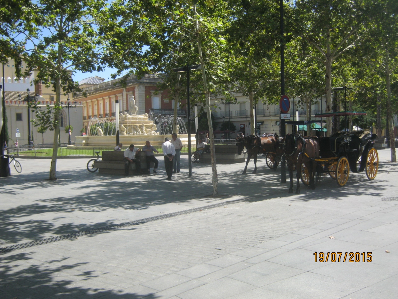 地下鉄の「プエルタ・デ・ヘラス」の近くに待機していました。この場所からはカテドラルやアルカサル、黄金の塔など旧市街地の重要な観光名所があります。そこを馬上からの眺めが魅力的です。時間的に余裕があればぜひ一度体験してもいいのでしょう。