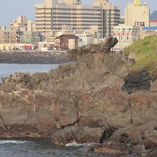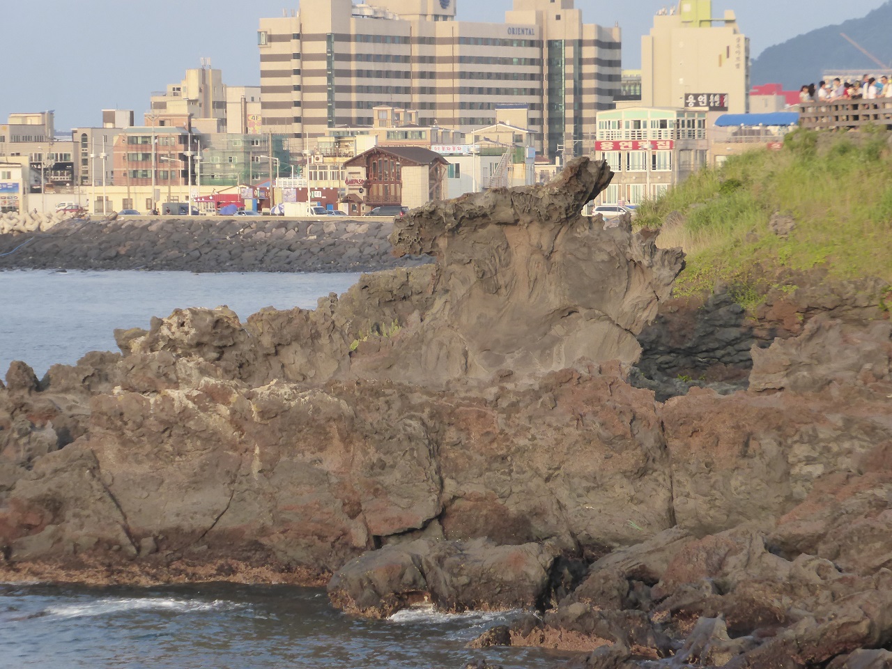 済州島ツアーで最初に訪れた観光地、龍頭岩。空港から近いので飛行機がまじかに見られます。溶岩塊で海中の龍宮から天に上る龍の姿に見立てられている。観光地なのでお土産さんやトイレもちゃんとあります。展望台のあるところまで歩いてもすぐなのでとりあえず写真撮影だけでも。