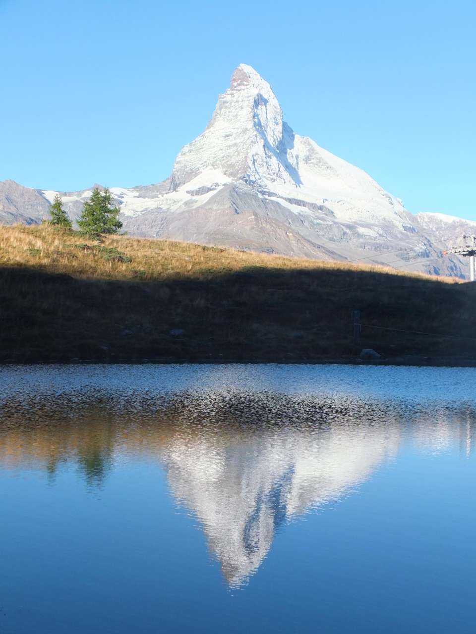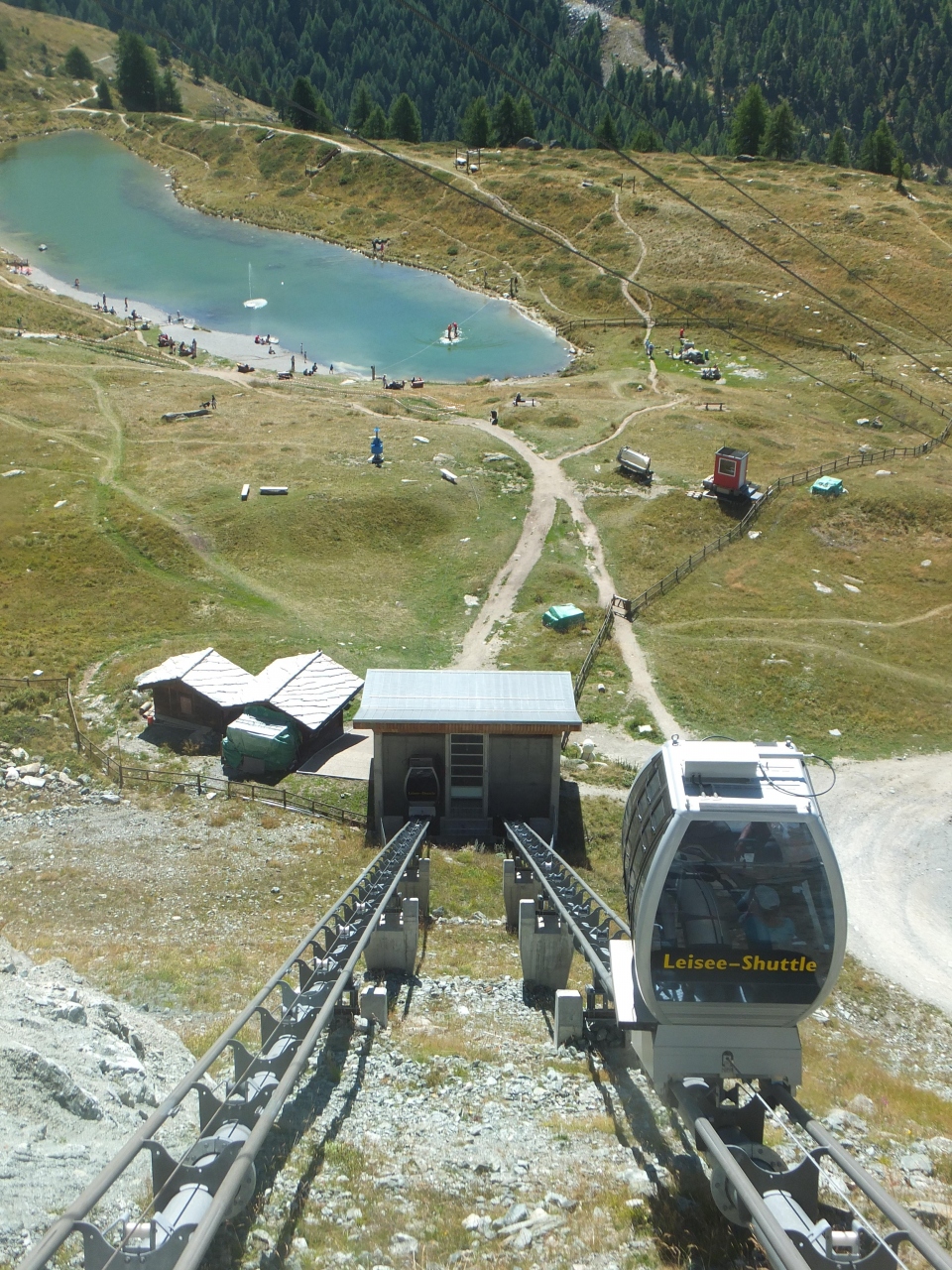 スネガはツェルマットから地下ケーブルカーで簡単に行ける展望台。そして、ケーブルカー駅のすぐ下にはライ湖があります。ケーブルカー駅からライ湖までは、距離は短いのですが、急坂です。ただ、ここには斜めに上昇・下降する無料のエレベーターもあります。ライ湖は、昼間は家族連れでにぎわい、水遊びをする子供もいます。天候次第でしょうが、朝のうちなら逆さマッターホルンを見ることもできます。