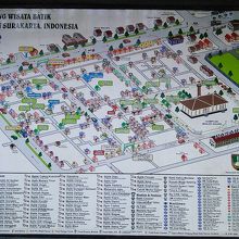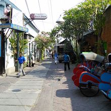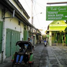 バティックの一大産地のソロにおいて、さらにその伝統工芸を実感できるエリア。街の喧騒からは離れた古きよき風情が漂う路地にいくつものバティック専門店が点在しています。路地各所に掲げられた案内地図を見るとその数の多さに驚かされます。大きめのショップから個人で営む零細店まで様々。中には時代の流れによるものなのか近年は廃業してしまうところも多いようです。ショップやホームステイなどに相談すれば工房見学や製作体験などをアレンジしてくれます。