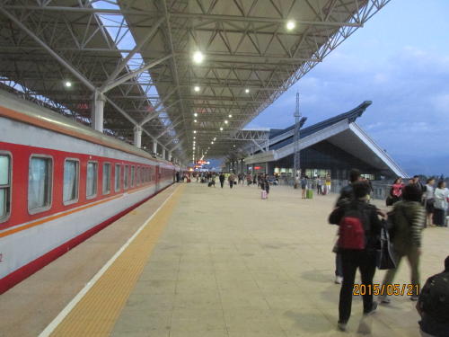 2009年10月に大理と麗江を結ぶ大麗線が開通し、昆明から麗江まで鉄道を利用して一晩で行けるようになりました。その終着駅は麗江東駅でした。大麗線が開通して2年も経たない、2011年8月17日(水)より麗江の駅が変更されました。新しい駅は麗江の南7km玉龍県にできた「麗江駅」です。皆さんの旅行記に麗江駅、麗江東駅が出て来るはずです。4、16、18路の市バスが運行されています。所要約20~30分、料金は1元。但しバスの始発は7:00です。早い時間の到着はタクシーで、20元くらいです。現在これまでの麗江東駅は貨物専用に変更されています。大麗線が開通し昆明―麗江の運行スケジュールは以下の通りです。乗車時間は約8時間位なので、長距離バスとさほど変わらない。昆明の中心部から郊外にある昆明西部バスターミナルまで移動することを考慮すると、昆明から麗江へ行くには、バスより鉄道の方が便利だと言えるでしょう。