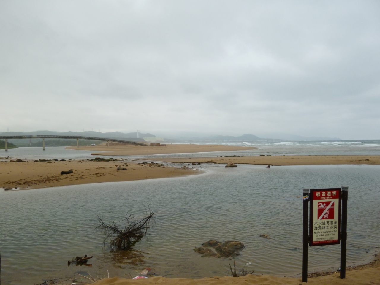 大回りしてキャンプ場の方から行くと無料の橋が有ってそこから砂浜に出れます。