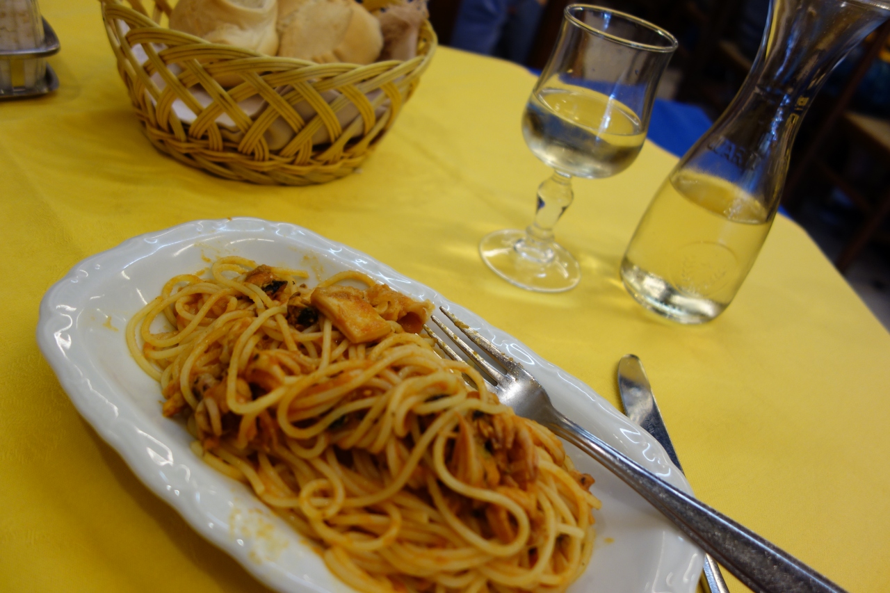 一方でメインのパスタはそれなりにおいしかったです。カラマリもボリューミーで食べきれない量。ワインもハーフボトル分ついて、17.5ユーロ。物価高めのヴェネツィアでもコスパはまずまずかな?
