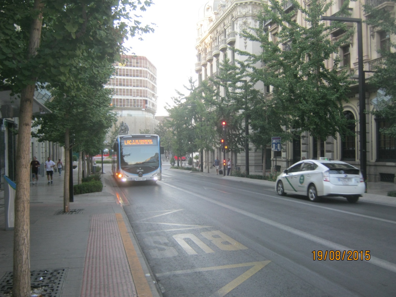 グラン・コロン通りを走る市バス(LAC)です。バスはこのグラナダでは市民の足です。観光用は別のアルハンブラバスと言われる小型のバスがあります。LACは各停留場に自動販売機がありチケットを購入します。英語でのガイドがあります。