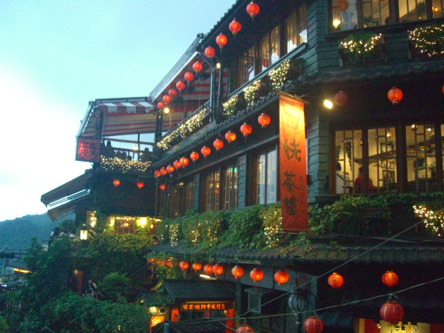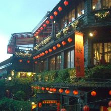 台北市内からバスで約1時間半程度。基山街に入ると、せまい通路の両側に土産物屋や飲食店など所狭しと密集しています。ハイライトは夜赤い提灯が点灯した阿妹茶酒館ですが、幻想的で美しくどことなく懐かしさを感じて癒されます。結構歩くので山々の風景を眺めながらのんびりお茶を飲むとほっと一息つけます。