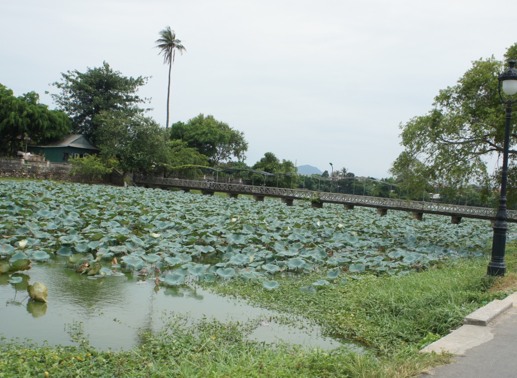 ベトナムの古都フエの王宮に入る前、シクロに連れて行かれた謎の湖(池)。水面いっぱいに蓮が育っていました。湖中央の島に渡る橋があり、そこが撮影スポットのようでした。橋を渡ると屋根のある建物がありました。カフェか何かが営業していたのかもしれません。ちゃんとした地図がないため、名前が分からないままでしたが、位置関係からタンタウ湖と考えています。王宮北側はこういう池があちこちにありました。かつては王族の住居や別荘などがあったのかなあ。池の真ん中だと涼しそうだし。
