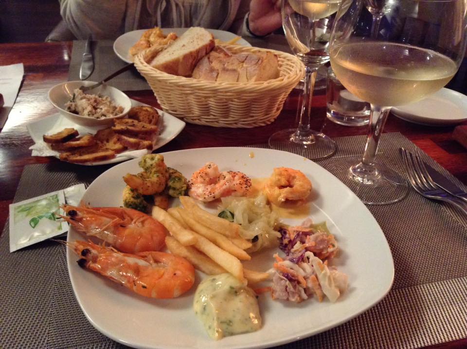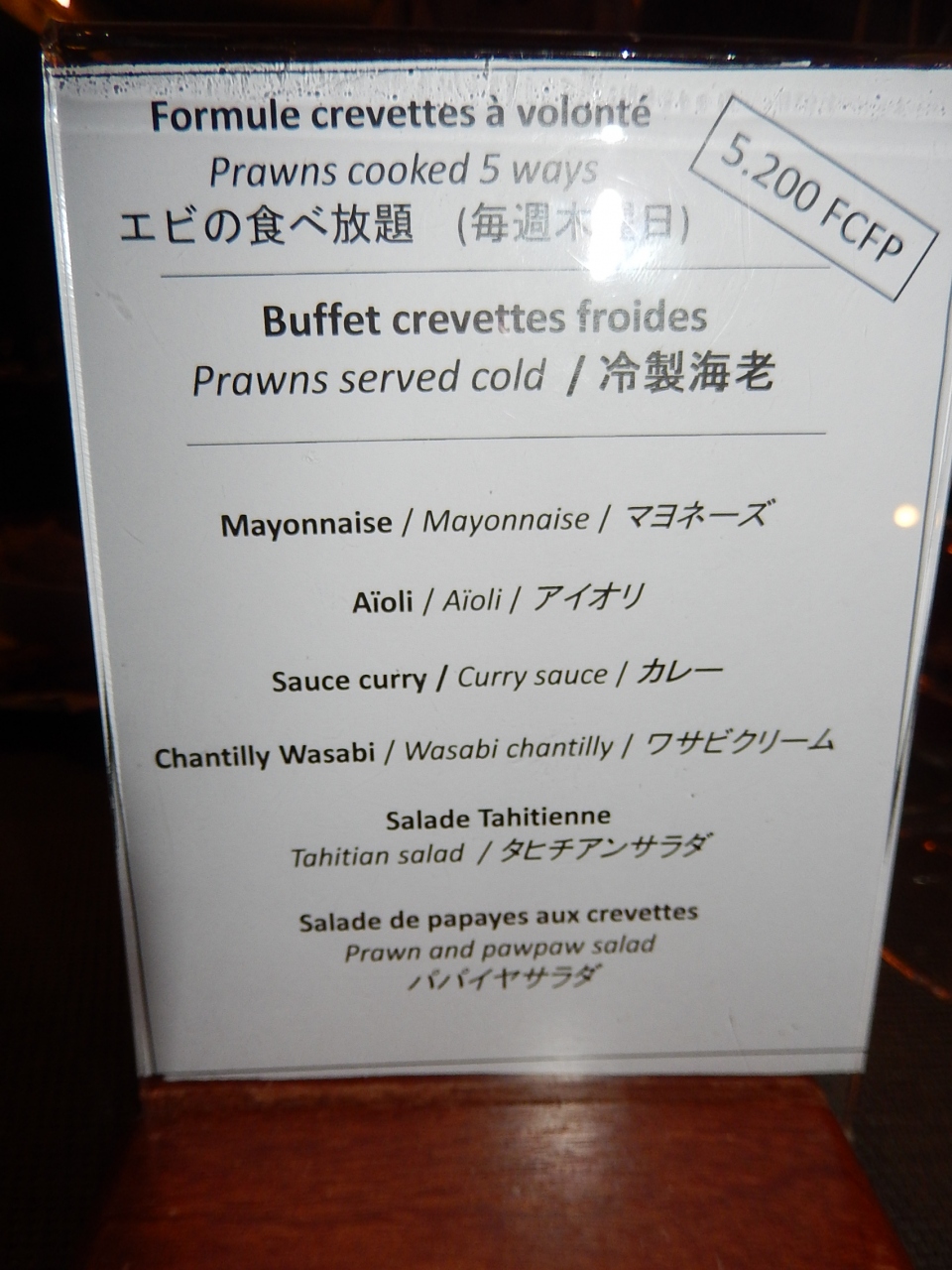 木曜日限定と限定の二文字に弱く、海老好き、そして帰国日で夜の時間があまりなかった私達にとって、泊っているホテルのレストランでの魅力的なディナー!最終日の夜にふさわしいとめちゃくちゃ楽しみに行きました。ビュッフェ形式とあったので、いろいろなサイドディッシュがあって、いろんな種類で調理された海老があるものと勝手に想像しておりました。ワインはサンセールの白を頼み、ツナのディップのバゲットは美味しく、いざ、海老へ…。温かい海老料理5品~バジルでソテーしたもの?・ココナッツ風味・クリーム煮等と茹でた海老の冷製、これを4種類のソースで食べます。いざ食べると、バジルと思っていたものはパクチー系の味、クリームも甘く…とにかく日本では口にしたことの無いような味ぱっかり。サイドメニューは、キャベツとズッキーニの炒め物とフライドポテトとタヒチアンサラダとか…確かに海老食べ放題ではありましたが、本当に海老ばかりで、これほどまでにフライドポテトが美味しいと思ったことはありませんでした。