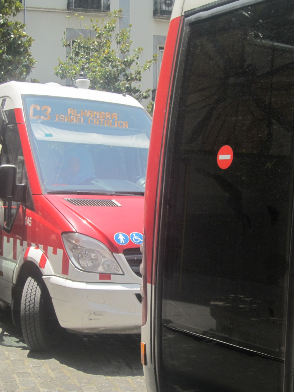 アルハンブラバスはアルハンブラ宮殿に行くときにC3.ヌエバ広場からニコラス展望台に行くのにC1に乗りましたが、小さい車なので満員の時もあります。アルハンブラ宮殿に行くときは同じバスが2台来ていました。