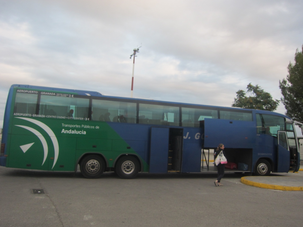 グラナダ駅近くのバス停から(グラナダ駅を出てまっすぐ進み、1本目を右に行くとバス停あり)、グランビア方向のLACバスを使いましたが、中に電光掲示板があったので迷わず降りることができました。チケットは乗り場にある機械で買います。地元の人の足でたくさん乗っていました。