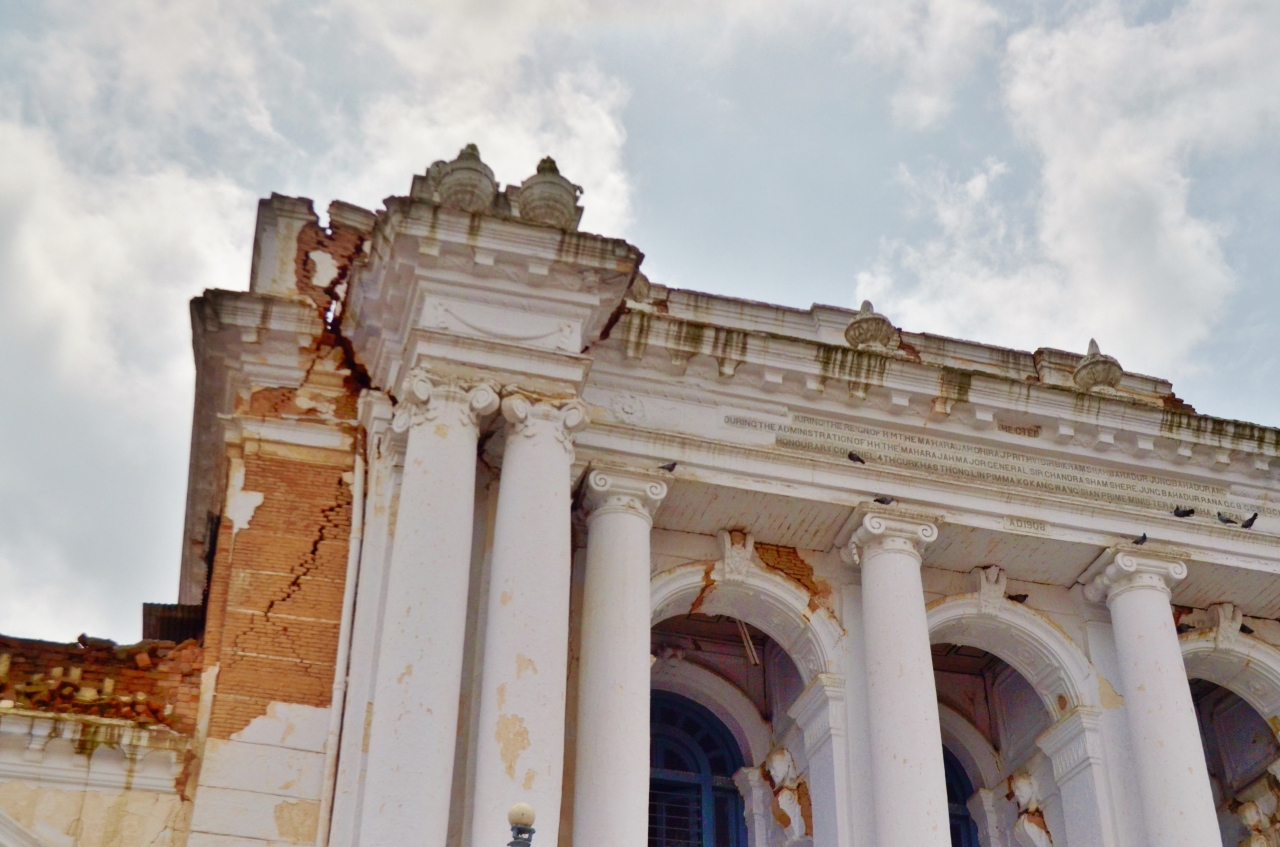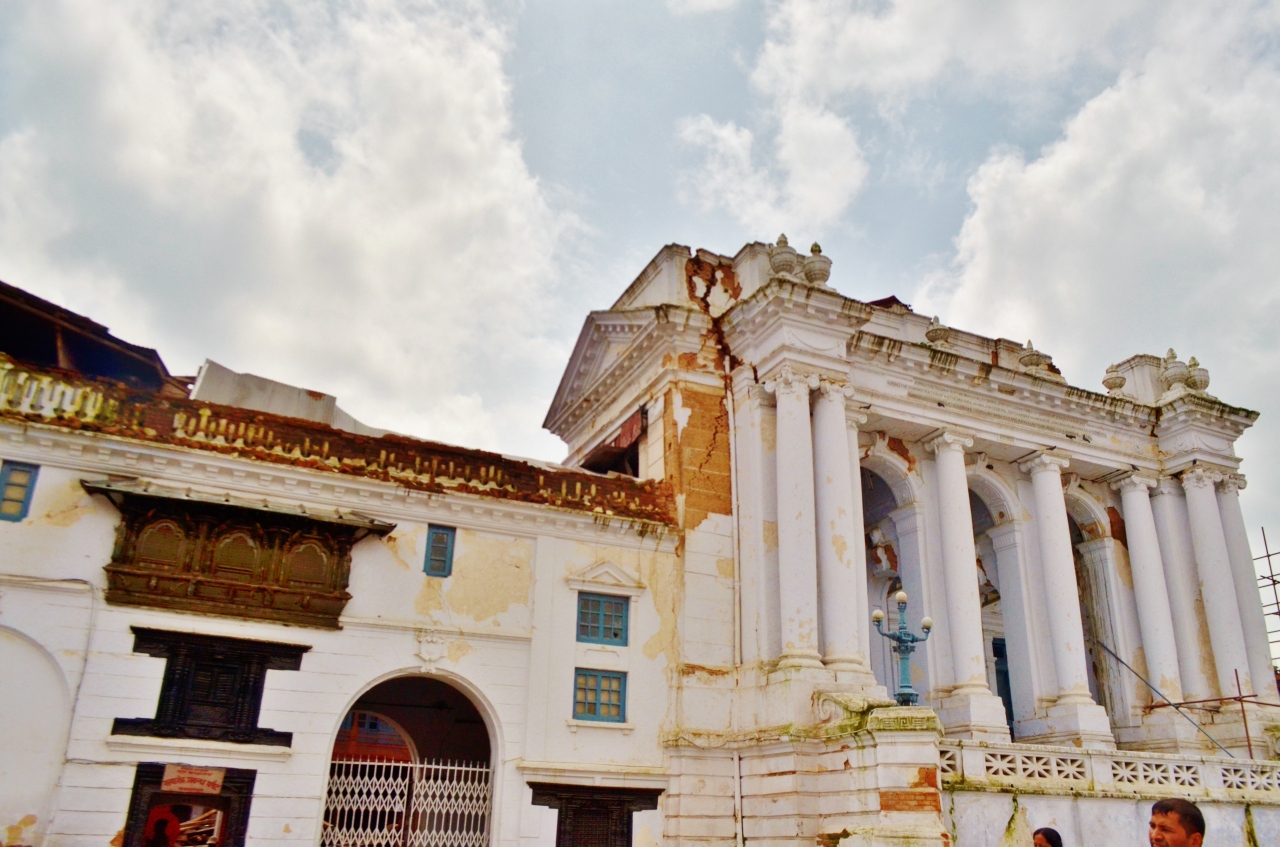 ネパールの首都、カトマンズのダルバール広場にある、唯一のヨーロッパ建築でもあるガッディ・バイタク。白亜の宮殿のような造りで1908年に建設されたもので、伝統的な建物が並ぶダルバール広場では異彩を放つ。ダルバール広場の建物の中では新しい建物だが、2015年4月25日に発生した震災の被害は甚大で、崩落寸前の状態が見てわかる。