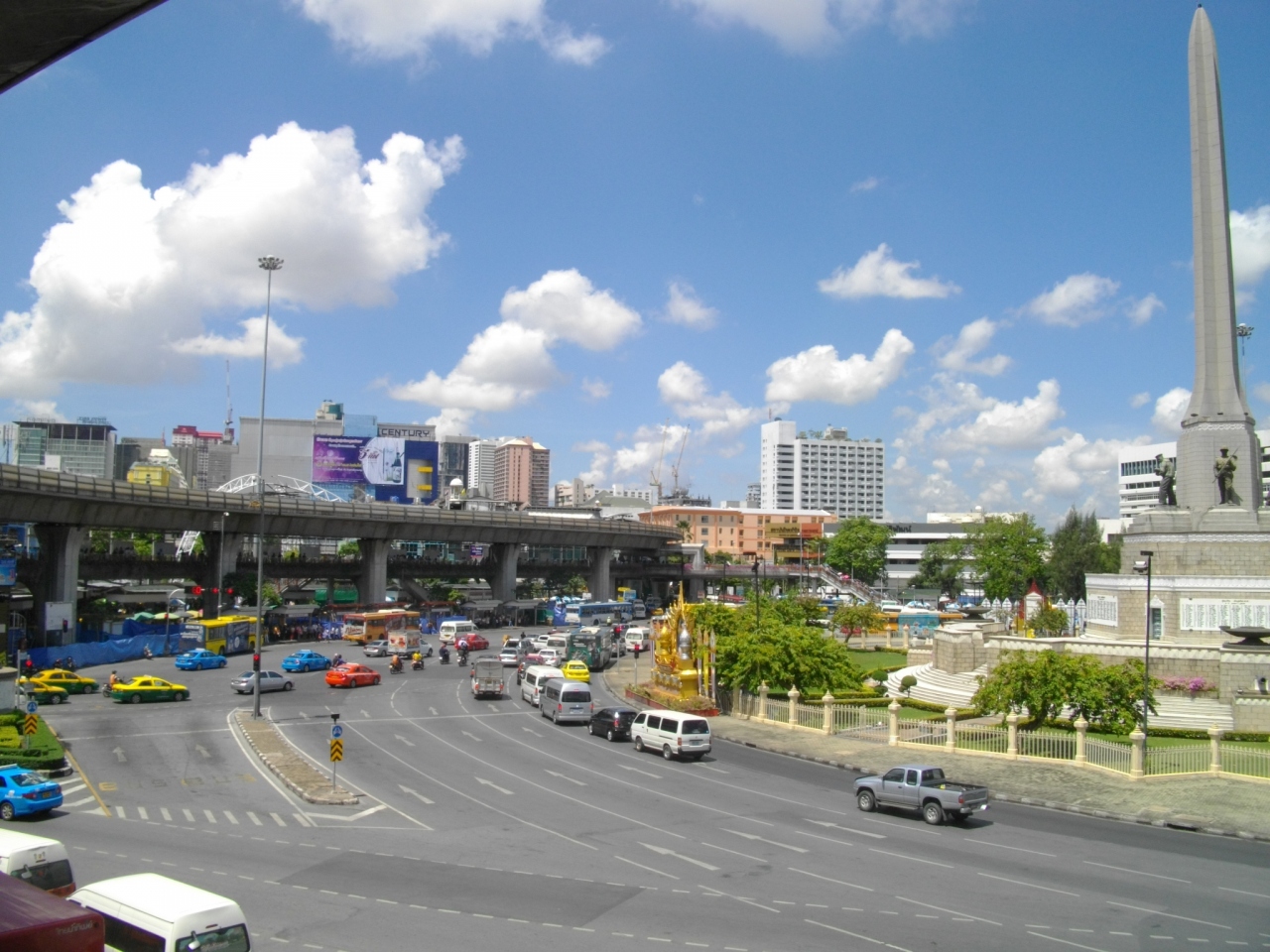 高架鉄道BTS(スカイトレイン)スクンビット線の駅で、現地では英語名のビクトリーモニュメント駅と記載されている。サイアム駅から3つ目である。駅前には大きなロータリーがあり、その中心に戦勝記念塔が高く聳えている。ロータリーは多くの自動車が通り、その周りには路線バスの停留所や多くのショップ、レストランがある。戦勝記念塔の見学や、ここから路線バスでカオサン等各地へ行くにはこちらの駅を利用するのが便利であり、利用することをお勧めする。