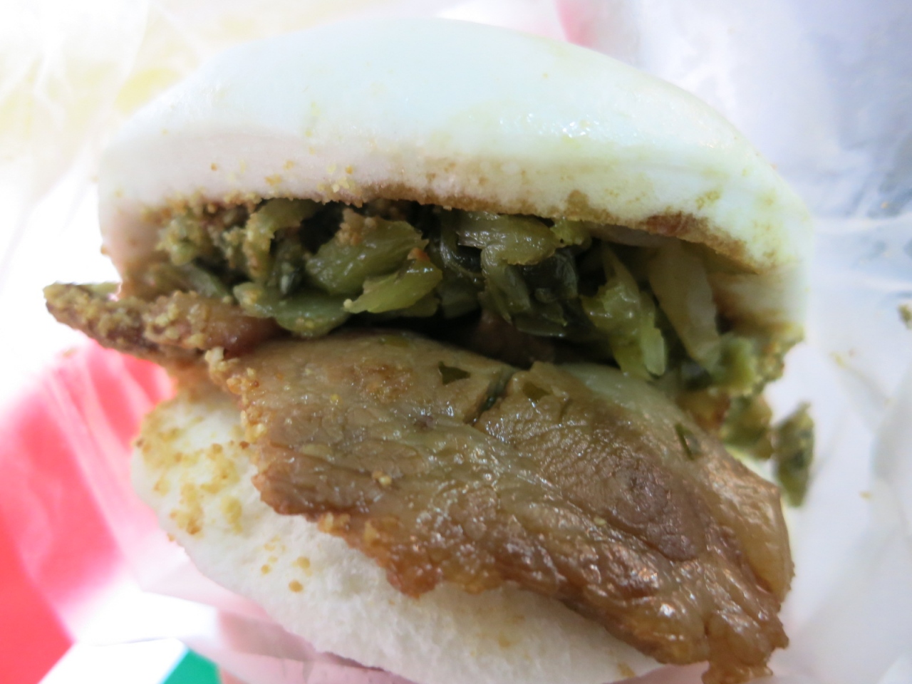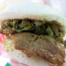 蒸しパンに豚の角煮や酸味のきいた高菜みたいな漬物をはさんだバーガーです。