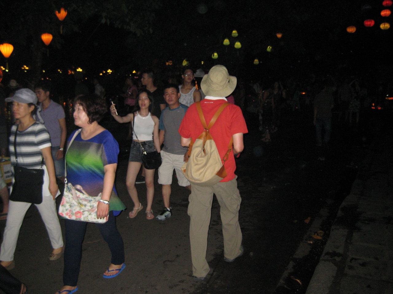 暗くなってからホテルからホイアンのランタン祭りを見学に行きました。日本橋付近の小さくて狭い橋の上から多くの人がランタンを川に流していました。川面には見物客を乗せた船も多く浮かんでいて、結構幻想的な雰囲気をでした。観光客も含めて多くの人が道にあふれていました。