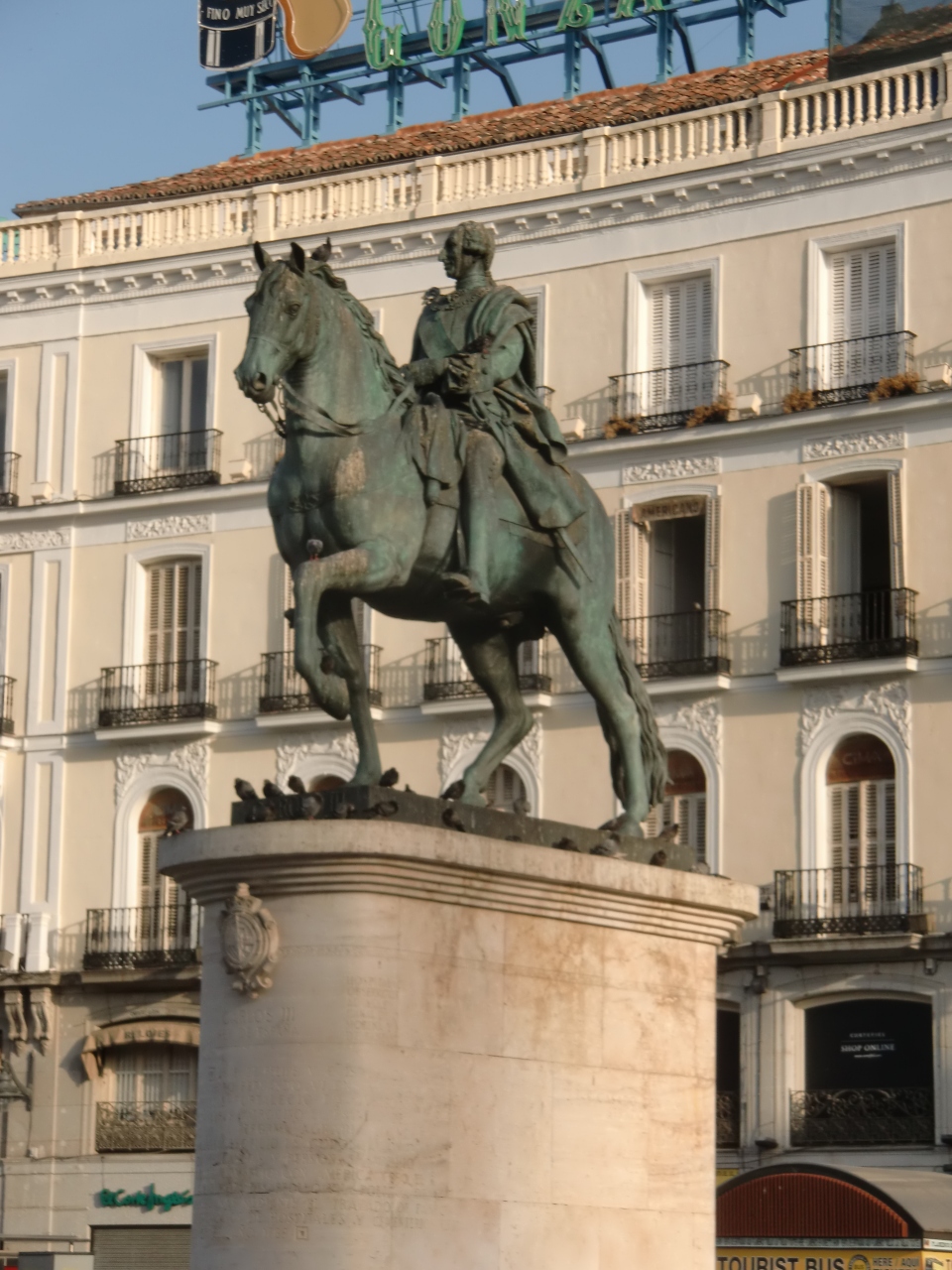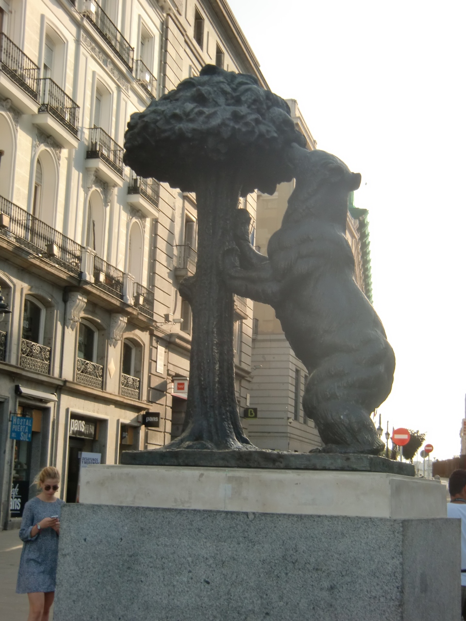 マドリード観光の拠点。地下鉄ソル駅を出たところが広場になっています。広場には、マドリードのシンボルである「熊とヤマモモの像」が立っています。マドリードの「交通起点0Km地点」にもなっており、東京で言えば「日本橋」と「渋谷ハチ公前広場」を足した感じです。大みそかのカウントダウンも行われるそうです。