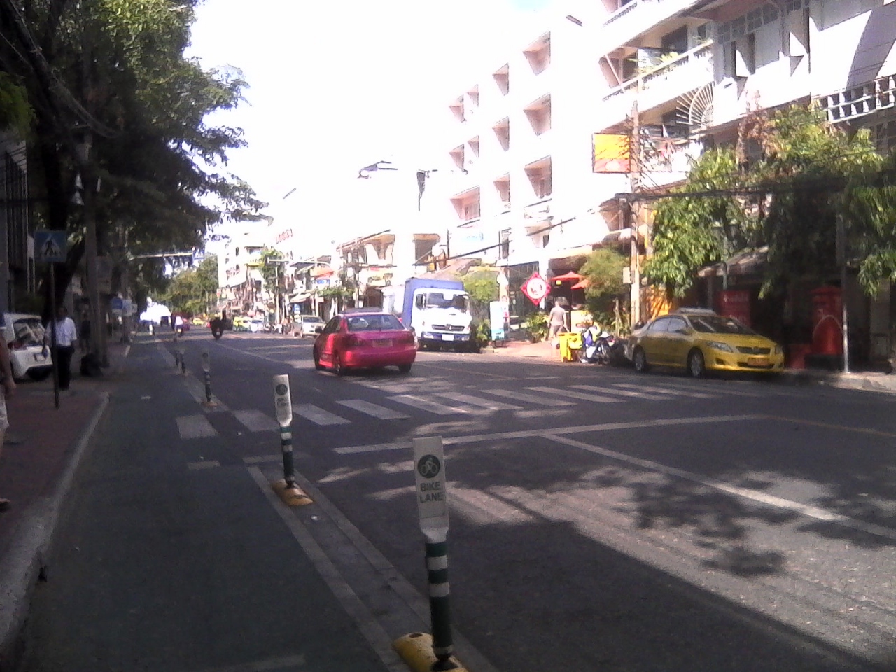約一年ぶりに訪れたプラアティット通りは、チャオプラヤ川側の人気通りです。比較的安くておしゃれなカフェや小奇麗なゲストハウスが立ち並んでいます。この通りの脇には、タイでは珍しく自転車専用通行帯が設置されていますので、カオサンのゲストハウスなどで貸し出されている自転車でサイクリングするにも、安全で気持ちいいと思います。