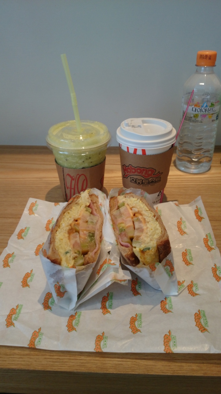 ホボンスペシャルトーストは、オニオン入りオムレツ、トマトに、プルコギを思わせる甘辛ソースの独特な味が、不思議とマッチして、今まで食べたことがない味のサンドイッチでした。