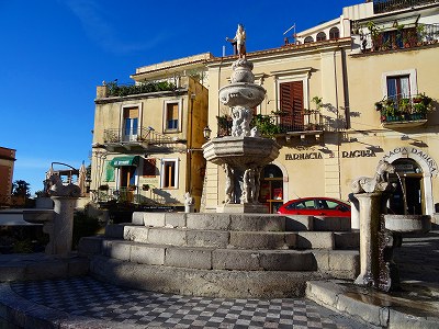 ★シチリア タオルミーナ 「ドゥオーモ広場 (Piazza Duomo)」 大聖堂前の広場です。とても広々としていて、海がきれいに見渡せます。エトナ山も見えますよ。一日中、人でにぎわっていますが、朝、夕の人がちょっと少なくなった時が狙いめです。