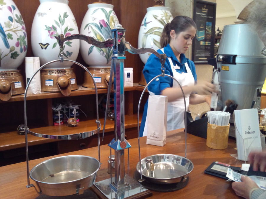 コーヒー豆を昔ながらの天秤と分銅で量り売りしてくれます。