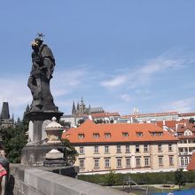 橋といっても、欄干のそばには、立派な像がいろいろあります。 そして、そのまわりで、パフォーマンスをする人、土産物を売る人、自分で描いたプラハ城などの絵を売る人、いろんな人々と観光客でいっぱいです。